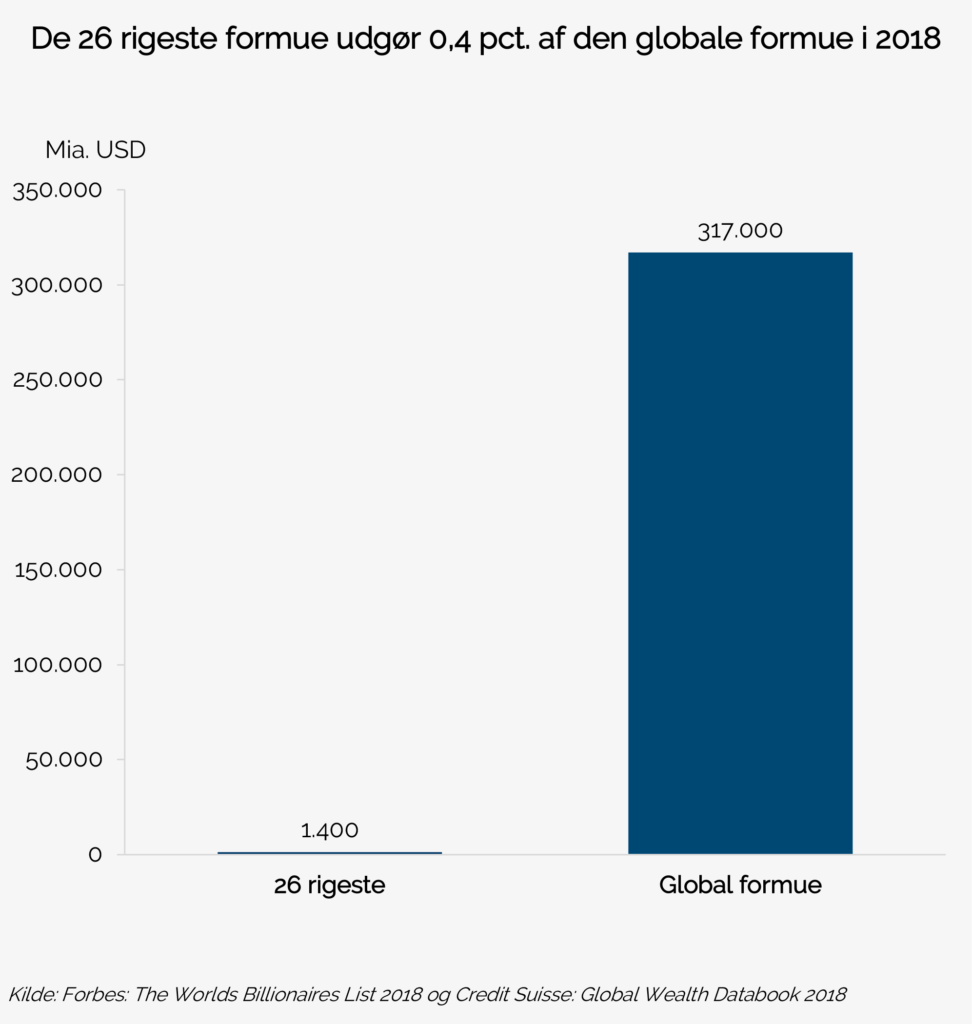 Et mere retvisende billede af de 26 rigestes formue fremkommer ved at sætte deres nettoformue i forhold til den samlede formue i verden. De 26 rigeste i verden havde 2018 en samlet formue på ca. 1.400 mia. dollars, jf. figuren. I forhold til den globale formue på 317.000 mia. dollars udgjorde de 26 rigestes formue 0,4 pct.