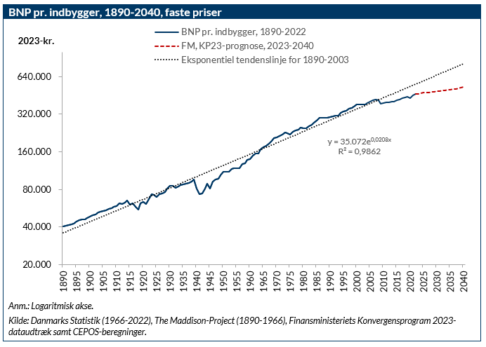 Danmarks BNP pr. indbygger udgør i 2023 84 procent af, hvad det ville have været, hvis Danmark de seneste 20 år havde fulgt trendvæksten siden 1890. Det svarer til en forskel på ca. 90.000 kroner pr. indbygger. Hver indbygger – spædbarn som olding – kunne altså have været 90.000 kroner mere velstående, hvis dansk økonomi fortsat havde været i stand til at levere den velstandsskabelse, som den har kunnet levere siden 1890.