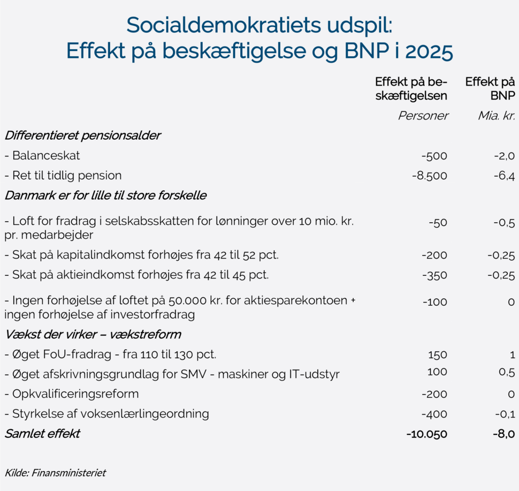 Mette Frederiksen og Socialdemokraterne har fremlagt en række udspil op til folketingsvalget i 2019. Hvis forslagene gennemføres, vil beskæftigelsen falde med ca. 10.000 personer, mens BNP vil falde med ca. 8 mia. kr., jf. tabellen. Opgørelsen er baseret på svar fra Finansministeriet.