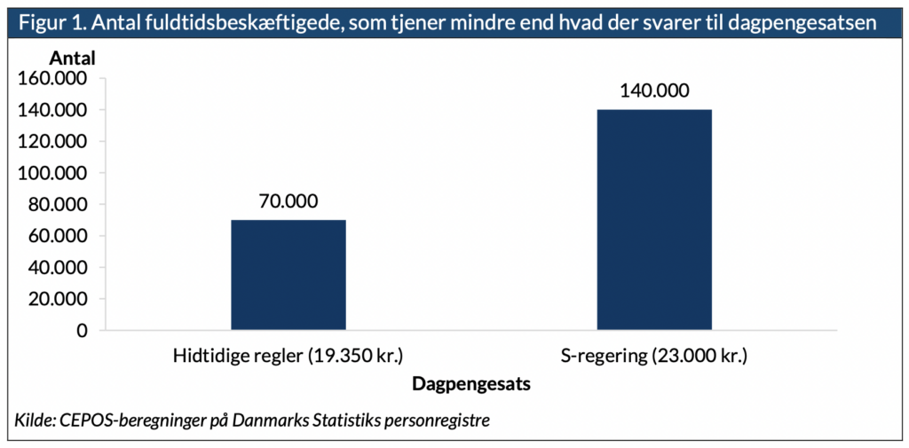 S-regeringen har indgået en aftale om, at dagpengene skal hæves til 23.000 kr. i de 3 første måneders ledighed. CEPOS har beregnet, at der på et givet tidspunkt er ca. 140.000 fuldtidsbeskæftigede lønmodtagere over 18 år, som har en månedsløn, der er mindre end, hvad der svarer til 23.000 kr. i dagpenge. Da lønmodtagere i modsætning til dagpengemodtagere betaler 8 pct. i arbejdsmarkedsbidrag, skal man have en løn på mindst 25.000 kr. ( 23.000/(1-0,08) ) for at få det samme udbetalt som en dagpengemodtager, der får 23.000 kr. i dagpenge.