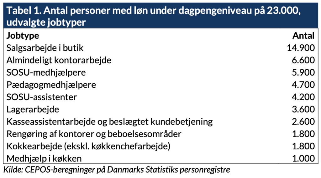 CEPOS har på Danmarks Statistiks personregistre beregnet, at 140.000 lønmodtagere tjener under de nye dagpengeniveau på 23.000 kr.