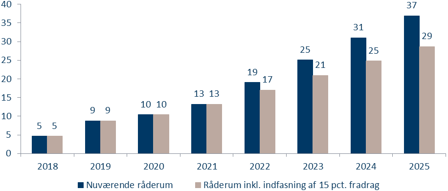 Figur 2. Råderum med og uden indfasning af forslag om 15 pct. pensionsfradrag i 2022-2025