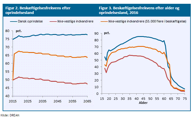 DREAM har for CEPOS beregnet, at ikke-vestlige indvandreres varige holdbarhedsbidrag til de offentlige finanser udgør -½ pct. af BNP svarende til en svækkelse på 11 mia. kr. Holdbarhedsbidraget dækker over befolkningsgruppens varige betaling af indkomstskat og afgifter fratrukket deres træk på den offentlige service og overførselsindkomster. Hvis dette negative bidrag til holdbarheden af de offentlige finanser skal vendes til et neutralt bidrag, skal beskæftigelsesgraden, ifølge DREAM, forbedres med 16 pct.point blandt ikke-vestlige indvandrere. Det svarer til 46.000 flere i arbejde i 2020 og 55.000 flere på langt sigt. Den højere beskæftigelse vil medføre, at velstanden vokser svarende til et løft på 1,2 pct. af BNP eller 24 mia. kr. (ca. 4.300 kr. i gennemsnit pr. dansker). Desuden vil de offentlige finanser blive forbedret svarende til, at der vil være et råderum på 11 mia. kr. til f.eks. lavere skat. Selv med en stigning i beskæftigelsesfrekvensen på 16 pct. point, vil ikke-vestlige indvandrere fortsat have en markant lavere beskæftigelsesfrekvens end personer med dansk oprindelse. Ikke-vestlige indvandreres beskæftigelsesfrekvens udgør i 2015 49,8 pct., mens personer med dansk oprindelse har en beskæftigelsesfrekvens på 74,6 pct. Tallene indikerer, at integrationsudfordringen er betydelig, og at der er brug for flere politik-tiltag for at løse den. CEPOS´ beregninger viser, at beskæftigelsen blandt ikke-vestlige indvandrere på langt sigt vil vokse med 7.000 personer, hvis arbejdsmarkedets parter indfører en indslusningsløn på 70 kr. i timen. Desuden er der mulighed for at effektivisere kommunernes formidling af job til flygtninge og indvandrere.