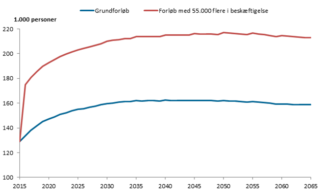 Hvis dette negative bidrag til holdbarheden på de offentlige finanser skal vendes til et neutralt bidrag, skal beskæftigelsesgraden ifølge DREAM forbedres med 16 pct.point blandt ikke-vestlige indvandrere. Antallet af indvandrere fra ikke-vestlige lande udgør i 2015 295.000 personer. Heraf er ca. 257.000 personer i den erhvervsaktive alder, hvilket stiger over tid. En stigning på 16 pct. point svarer til 46.000 flere i arbejde i 2020 og 55.000 flere på langt sigt, jf. figur 1. Løftet i beskæftigelsesfrekvensen sker ved, at ikke-vestlige indvandrere, der er udenfor arbejdsstyrken, løftes ind i arbejdsstyrkenPersonerne, der kommer i job, kommer fra følgende grupper: Førtidspensionister, orlovsydelse, sygedagpenge, aktiveringsydelse, kontanthjælpsmodtagere udenfor arbejdsstyrken, overgangsydelse, flexydelse, introduktionsydelse og selvforsørgende udenfor arbejdsstyrken. . Nedenfor ses den stigning i beskæftigelsen, der er nødvendig, hvis nettobidraget skal være neutralt for de offentlige finanser. Det er lagt til grund, at beskæftigelsen stiger allerede fra 2016. Hvis stigningen i beskæftigelsen først indtræder på et senere tidspunkt, så skal beskæftigelsesgraden øges med mere end 16 pct. point i de resterende år.