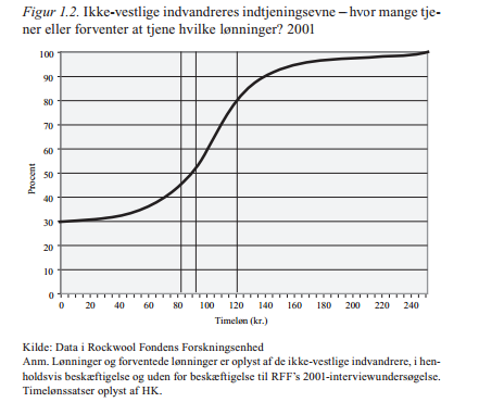 Med denne antagelse kan det, ud fra Rockwool Fondens undersøgelse og antallet af ikke-vestlige indvandrere, beregnes, at der vil være ca. 35.000 ikke-vestlige indvandrere som potentielt kunne tage et job til mellem 70 og 110 kr. i timen, og at den nuværende beskæftigelsesgrad for disse personer er 35 pct.