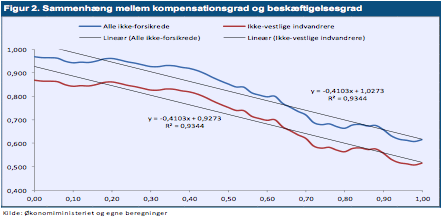 En central antagelse i analysen er, at såfremt lavproduktive indvandrere får adgang til arbejdsmarkedet, vil beskæftigelsesgraden for fremtidige indvandrere være 10 pct.-point mindre end for befolkningen som helhed (for en given kompensationsgrad). Såfremt beskæftigelsesgraden bliver lige så stor som for hele befolkningen, bliver beskæftigelseseffekten ca. 10.000 personer, hvorimod en mindrebeskæftigelse på 20 pct.-point reducerer effekten til 4.000 personer, jf. tabel 3.