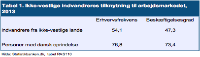 En fremgang i beskæftigelsen besværliggøres af, at en del ikke-vestlige indvandrere har en produktivitet, der må formodes at ligge under 110 kr. i timen, som er den reelle mindsteløn i Danmark. Rockwool Fondens forskningsenhed har dokumenteret dette.Kilde: Jensen, Bent (2007) Indvandringen til Europa. Velfærdsstat og integration. Rockwool Fondens Forskningsenhed Derved har de meget svært ved at deltage i det organiserede arbejdsmarked. En person, der f.eks. kun kan producere for 70 kr. i timen, har meget svært ved at blive ansat af en arbejdsgiver, der skal betale 110 kr. i timen (mindstelønnen).