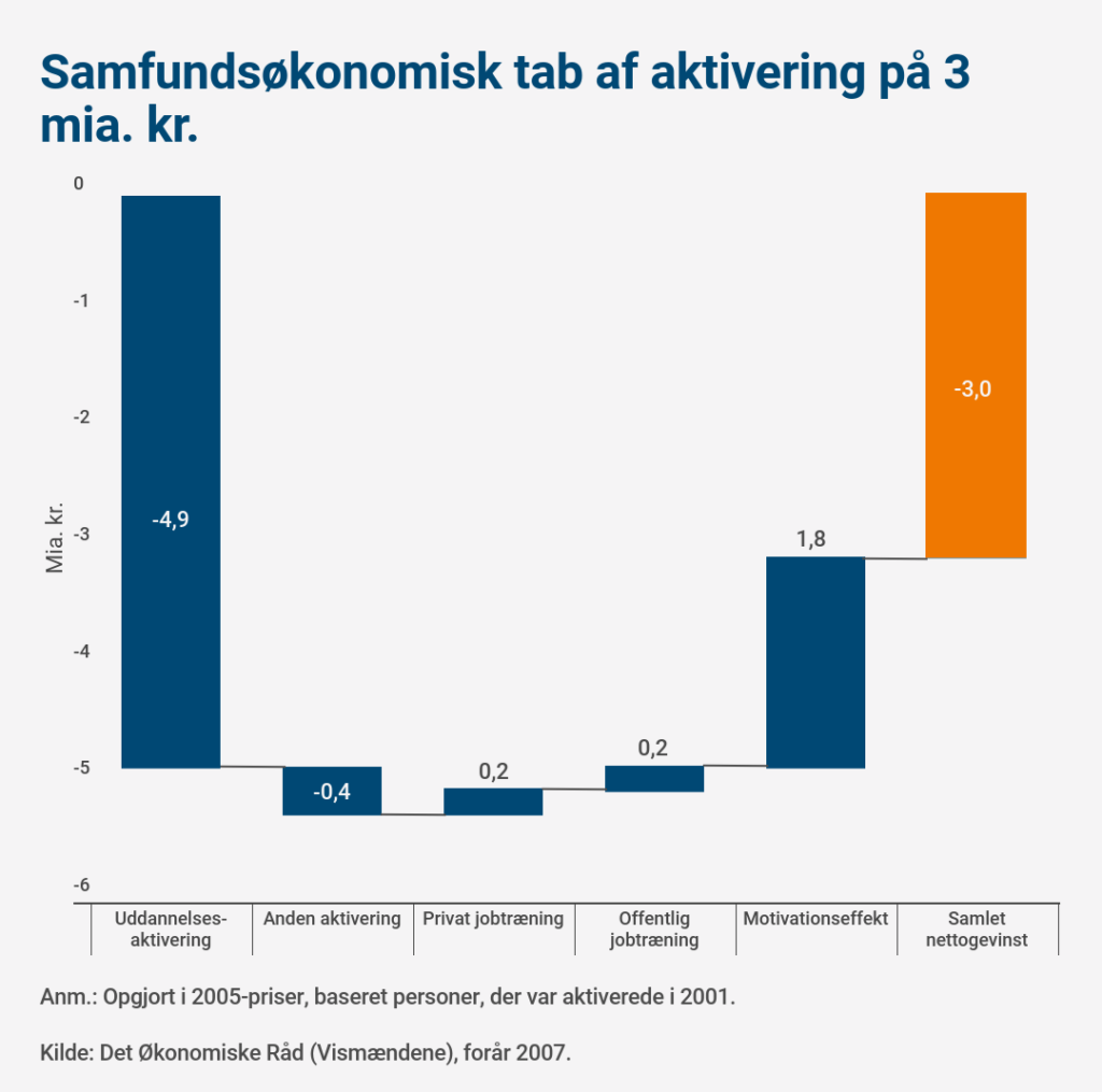 Samlet konkluderer vismændene at: ”Analyserne i kapitlet viser et samfundsøkonomisk underskud af aktiveringspolitikken i 2001 på 3 mia. kr. … Resultatet skyldes især, at uddannelsesaktivering giver et stort underskud, mens motivationseffekten bidrager positivt.”, jf. også figuren.Den samfundsøkonomiske værdi af aktiveringspolitikken er opgjort som beskæftigelses- og løneffekter af aktivering fratrukket omkostninger ved aktiveringen, herunder udgifter til administration og afholdelse af kurser samt skatteforvridningstab ved at finansiere udgifterne.