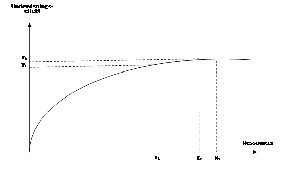 Figuren ovenfor illustrerer sammenhængen mellem forbrugte ressourcer og resultater målt som undervisningseffekt, samt hvorfor tilførsel af flere ressourcer ikke nødvendigvis medfører en større effekt. Kurven beskriver den aftagende effekt af at tilføre yderligere ressourcer. Efter punktet X2 vil tilføjelse af yderligere ressourcer ikke give nogen positiv effekt. Hvor punktet i virkelighedens verden ligger, er ikke let at afgøre, men det er intuitivt klart, at man på et eller andet tidspunkt vil nå et maksimum for mulig indlæring. Såfremt der tilføres ressourcer til skoleområdet svarende til X2, men beløbet mellem X2 og X1bruges til ikke-undervisningsrettede aktiviteter (Slack), vil det betyde en mindre undervisningseffekt svarende til afstanden mellem Y2 og Y1. Ligger man i punktet X3, ville det ikke betyde en nedgang i effekt, at man pga. slack kun bruger ressourcer på undervisning, der svarer til punkt X2 , men fjerner man slacket, ville kommunen til gengæld kunne spare ressourcer svarende til afstanden mellem X3 og X2, uden det ville betyde en nedgang i effekten.