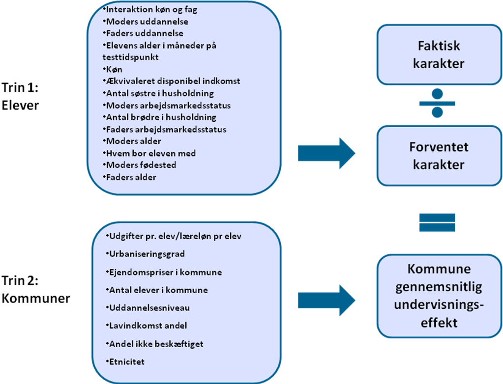Figuren ovenfor illustrerer sammenhængen i analysen. I trin 1 arbejdes der på elevniveau. På baggrund af en række baggrundsfaktorer af økonomisk og social karakter udregnes vha. en OLS regression en forventet karakter for den enkelte elev i det enkelte fag. Denne karakter sættes i forhold til den faktiske karakter, og forskellen (residualet) anvendes således som undervisningseffekten. De enkelte elevers undervisningseffekt aggregeres til kommuneniveau og anvendes i trin 2 som den afhængige variabel. I dette trin undersøges sammenhængen mellem kommunens undervisningseffekt og en række baggrundsfaktorer på kommuneniveau.