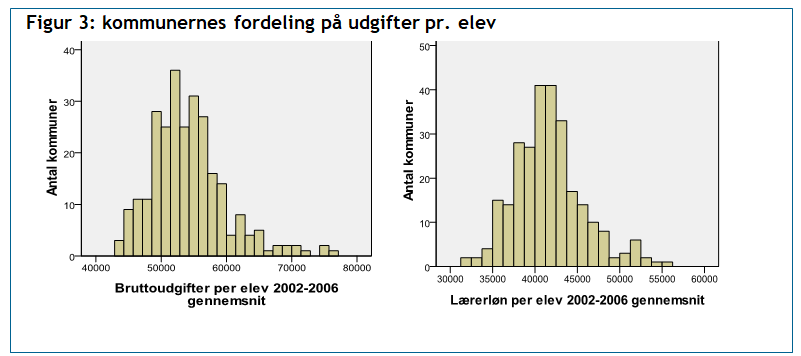 I figurerne nedenfor er det vist, hvorledes kommunerne fordeler sig på udgiftsniveau. Figuren illustrerer relativt store forskelle mellem kommunerne både med hensyn til femårsgennemsnittet for de totale udgifter pr. elev (mellem 43.300 og 77.100 kr.) og med hensyn til lærerlønningerne pr. elev (mellem ca. 31.700 og 55.600 kr.).Fordelingen af de øvrige anvendte variabler fremgår af appendiks.