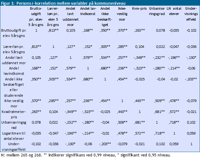 tabellen nedenfor vises korrelationen mellem alle variablerne, der er inkluderet i analysen. Tal i hver celle angiver korrelationskoefficient (persons r der varierer mellem -1 og 1). Som det fremgår af tabellen, er der ikke umiddelbart en signifikant sammenhæng mellem undervisningseffekt og de anvendte ressourcer målt vha. bruttoudgifter og lærerlønninger pr. elev, og fortegnet er endda det omvendte af det forventede. Den angivne persons r på -0,102 er dog ikke signifikant forskellig fra nul. Undervisningseffekten korrelerer negativt og signifikant med andel af forældrene, der ikke er beskæftigede, og andelen af lavtuddannede. Dette er specielt interessant, da der allerede er kontrolleret for dette i trin 1. I øvrigt viser tabellen også, at der som forventeligt er en stærk korrelation på 0,813 mellem de to inputmål: bruttoudgifter og lærerlønninger. Ligeledes er der forventeligt også en meget stærk sammenhæng mellem urbaniseringsgrad og ejendomspriser, idet ejendomspriserne er højere i tættere befolkede områder. Samtidig er der også som forventet en meget stærk korrelation mellem andel af lavt uddannede og andel med lav indkomst. På trods af at den indbyrdes høje korrelation kan skabe problemer i regressionsmodellen medtages alle variablerne dog indledningsvist i analysen, da formålet er at kontrollere effektivt for sociale baggrundsfaktorer for at afgøre, om der er en signifikant effekt af forbruget af ressourcer.