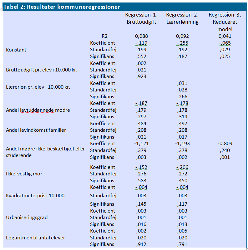 I tabellen nedenfor ses resultatet for tre forskellige regressionsanalyser, hvor de faktorer, der er beskrevet ovenfor, er medtaget[1]. Første søjle viser, hvilke variable der er medtaget i modellerne. I de to første søjler er vist resultaterne for modeller, hvor alle variabler (også statistisk insignifikante) er medtaget. Den første model anvender fem års gennemsnittet (2002-2006) af de totale bruttoudgifter pr. elev som mål for anvendte ressourcer, og i den anden anvendes femårsgennemsnittet for lærerudgifter pr. elev som mål for anvendte ressourcer. Den sidste af de tre modeller viser udelukkende de statistisk signifikante sammenhænge, hvor hverken bruttoudgift pr. elev eller lærerløn pr. elev indgår.
