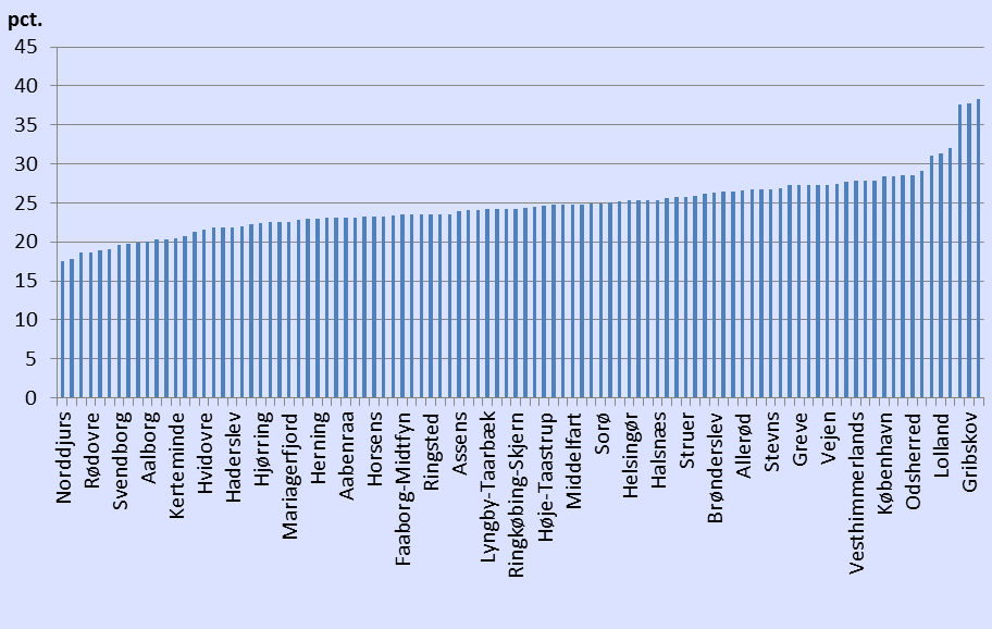 Aftalen om øget udlicitering kom til at gælde kommunesektoren under et. Der er dog stor forskel på, hvor meget de enkelte kommuner gør brug af udlicitering. Privat leverandør indikatoren er vist for hver enkelt af de 98 kommuner i den følgende figur.