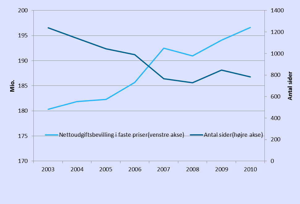 Af figur 3 ses at antallet af medarbejdere i Rigsrevisionen er steget samtidig med at antallet af sider i beretninger og notater er faldet. Tilsvarende er bevillingen til Rigsrevisionen i faste priser steget betydeligt i perioden 2003-2009, jf. figur 4.