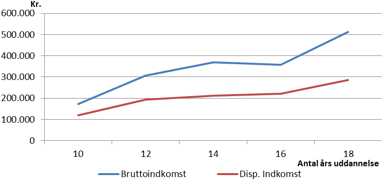 Figurens analyse er en tydelig anskueliggørelse af, at uddannelse og den heri indlejrede viden bidrager til at skabe værdi. Jo højere uddannelse, jo højere betaling er arbejdsmarkedet gennemgående villig til at yde for den arbejdsindsats, som de pågældende præsterer. Denne sammenhæng er meget sikker på det danske arbejdsmarked, men på den anden side er sammenhængen mellem uddannelse og indkomst svagere i Danmark end i de fleste andre OECD-lande, hvad der nærliggende kan hænge sammen med den høje danske marginale beskatning af indkomster. Det ses således også, at de disponible indkomsters øgning med længere uddannelse er væsentlig mere beskeden end bruttoindkomstens øgning, hvad der jo kan opfattes som en beskatning på uddannelse.