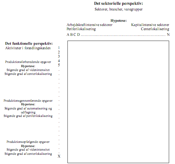 Dynamikken i omorganiseringen af produktionen er illustreret i figur 2.2. De lodrette søjler udtrykker det traditionelle industrisamfunds organisering, hvor branchetilhørsforhold var afgørende for, hvor det var fornuftigt for virksomheder at lokalisere sig. Her er det de mest kapitalintensive industribrancher som kemisk industri og farmaceutisk industri, som gennemgående har den mest centrale lokalisering. Det hænger nok sammen med, at kapital historisk set har været en langt mere udpræget lokal produktionsfaktor, end tilfældet er i dag. Det var tidligere primært lokale pengeinstitutter, som betjente det lokale erhvervsliv. Derimod blev industri, som primært betjener sig af arbejdskraft i produktionen, som træindustri og keramisk industri, overvejende lokaliseret i landets perifere områder.