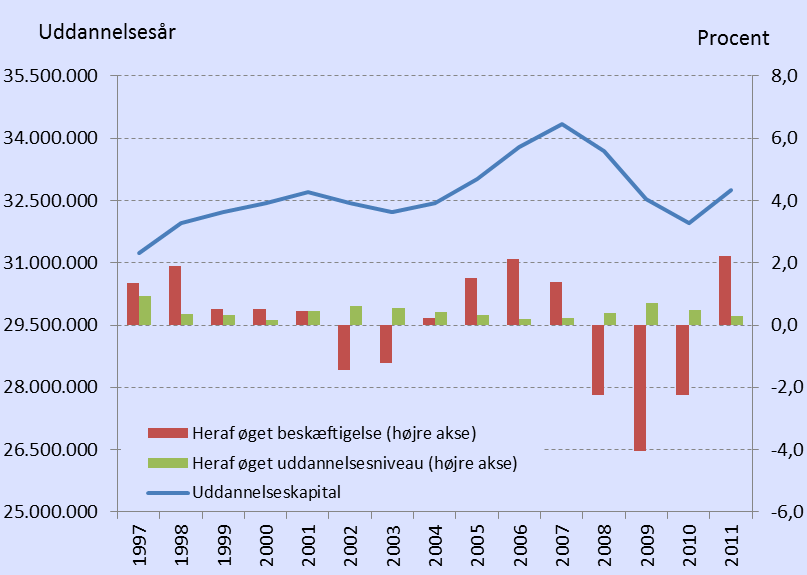 Det har været en langsigtet tendens, at indsatsen af viden i den danske produktion målt ved antal uddannelsesår i den beskæftigede arbejdsstyrke, er øget til stadighed. I 1996 rådede den samlede danske økonomi over 30,5 millioner uddannelsesår, hvad der svarer til, at antallet af beskæftigede var 2,6 millioner, og at den gennemsnitlige uddannelseslængde hos personerne i beskæftigelsen var 11,7 år. Indsatsen af uddannelsesår i produktionen er herefter over den efterfølgende femtenårs periode frem til 2011 øget til 32,8 millioner uddannelsesår. Det svarer til en gennemsnitlig årlig tilvækst på 0,5 procent.
