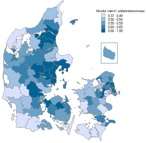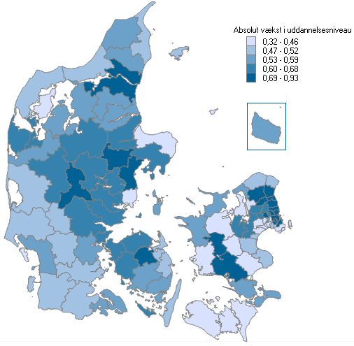 Dette mønster er blevet uddybet gennem de senere år. I figur 4.2 er vist, hvor meget uddannelsesniveauet blandt de beskæftigede med bopæl i de enkelte kommuner er øget i perioden fra 1996 til 2011. Det ses, at der er et besnærende sammenfald mellem mønsteret i figur 4.1 og mønsteret i figur 4.2. De beskæftigedes uddannelsesniveau er blevet øget mest, der hvor uddannelsesniveauet i forvejen var højest, nemlig i landets største centerområder.