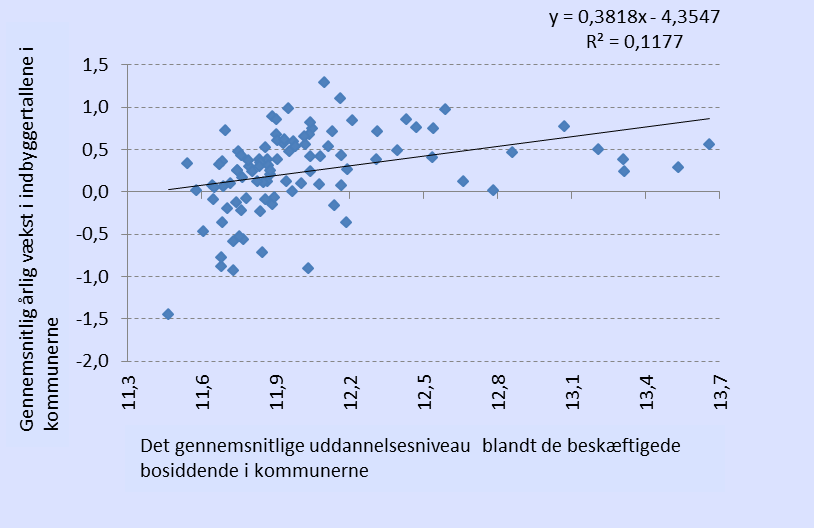 Konsekvenserne af det mønster, der tegner sig i figur 4.5, er mere systematisk undersøgt i figur 4.6. Her viser det sig, at der findes en systematisk sammenhæng, så befolkningsmæssig tilbagegang er forbundet med et svagt lokalt uddannelsesniveau.