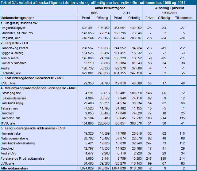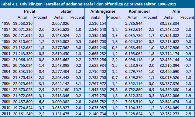 Set over hele den beskrevne periode fra 1997 til 2011 har den offentlige sektor optaget en stigende andel af økonomiens samlede mængde af viden udtrykt ved antal uddannelsesår. Hvor det i 1997 var 35,8 procent af alle uddannelsesår, som var beskæftiget i den offentlige sektor, så var andelen i 2011 steget til 38,5 procent. Inden for den offentlige sektor er det især i kommunerne, at anvendelsen af uddannelsesår er øget. I øvrigt ses i tabellen, at den kommunale strukturreform tydeligt flyttede om på personaleanvendelsen inden for det offentlige område.