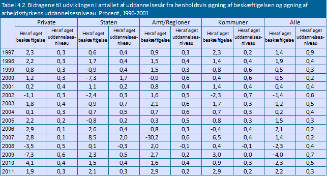 Der tegner sig i tabel 4.2 et billede af konjunkturbevægelser i udviklingen i anvendelsen af uddannelseskompetencer. Senest ses, at den samlede beskæftigelse er gået tilbage efter 2007, og at der under dette konjunkturtilbageslag er foregået en relativ forskydning i arbejdskraftanvendelsen, således at der er overført arbejdskraft fra den private sektor til den offentlige sektor. I denne periode med relativt stærk øgning af den offentlige beskæftigelse og med beskæftigelsestilbagegang i den private sektor er det i særlig grad arbejdskraft med svage uddannelsesmæssige ressourcer, som er blevet udskilt i den private sektor og har udgjort et synligt arbejdskraftudbud til rådighed for den offentlige sektor. Det har den offentlige sektor benyttet sig af. Konsekvensen ses at være, at uddannelsesniveauet i denne periode er øget stærkere i den private sektor end i den offentlige sektor.