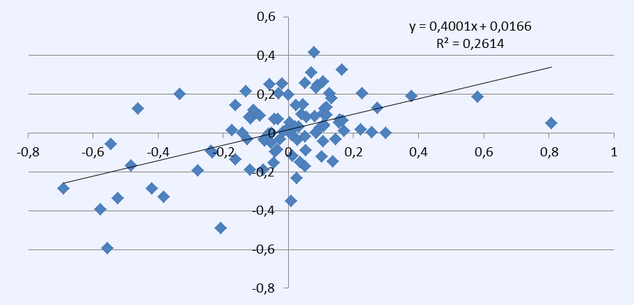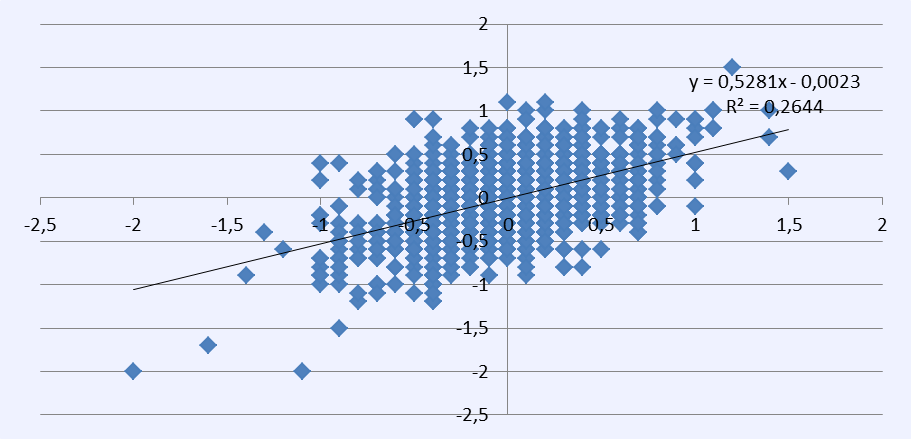 I figurerne 2 og 3 er henholdsvis de enkelte skolers og de 98 kommunale skolevæseners opnåede undervisningseffekter i 2014 sat i forhold til de opnåede effekter året forinden. Der fremkommer en væsentlig statistisk sammenhæng, men der foregår også væsentlige forskydninger.