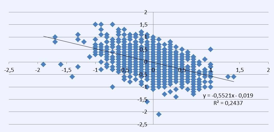 Der viser sig ikke at bestå nogen betydende statistisk sammenhæng mellem skoleudgifter per elev og undervisningseffekt. Det gælder såvel i 2010 som i 2014. Fortegnet er faktisk negativt, men der er slet ikke nogen statistisk signifikans til stede.