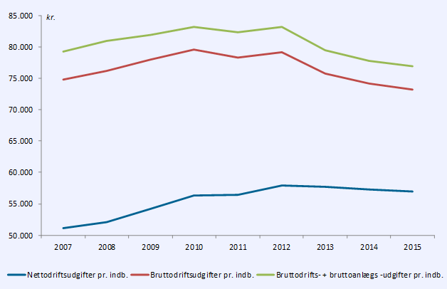 Figuren viser også udviklingen i kommunernes nettodriftsudgifter. Her er der i forhold til bruttodriftsudgifterne foretaget modregning for de refusioner fra staten, som kommunerne modtager, og for driftsindtægter fra eksempelvis brugerbetaling. Det er bemærkelsesværdigt, at nettodriftsudgifterne har fulgt en anden udviklingslinje end bruttodriftsudgifterne. Nettodriftsudgifterne, som altså udgør de udgifter, der skal finansieres med kommunernes egne skatteindtægter og med bloktilskud fra staten herunder gennem den kommunale udligningsordning, fulgte med op, da bruttodriftsudgifterne gik i vejret frem til 2010. Nettodriftsudgifterne har imidlertid fortsat øgningen frem til 2013, hvorefter der viste sig en blot beskeden tilbagegang.