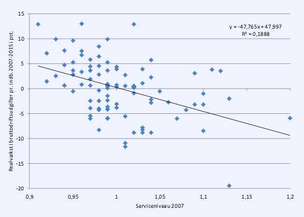 Figurerne 10 og 11 tegner til sammen billedet af en udvikling kendetegnet ved konvergens. Bruttodriftsudgifterne per indbygger beskriver det absolutte reale aktivitetsomfang mens serviceniveauet opgøres som et relativt mål i forhold til landsgennemsnittet og tager højde for ændringer i udgiftsbehov i løbet af perioden. På figurerne er angivet et mål for præcisionen i den sammenhæng, som bliver beregnet i form af den såkaldte R2 værdi. Sammenhængen mellem serviceniveauet i 2007 og udviklingen siden i serviceniveau er klart skarpere end sammenhængen mellem serviceniveauet i 2007 og udviklingen i udgiftsniveauet. Det er i overensstemmelse med, at der siden 2007 er foregået en udjævning mellem kommunerne af serviceniveauerne.