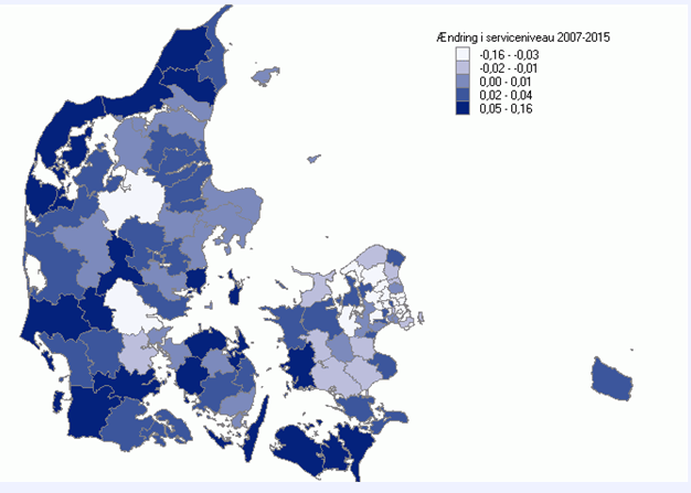 Udviklingen i udgifter og service kan også illustreres på et Danmarkskort. Det er gjort i figurerne 12 og 13.