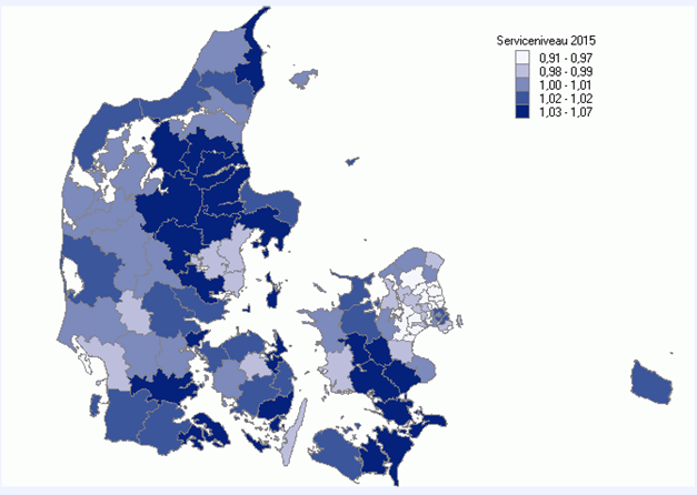 I og med, at den stærke skærpelse af den regionale økonomiske omfordeling ikke i nævneværdigt omfang har ledt til udjævning af kommunernes skattetryk, så er tilpasningerne i de enkelte kommuner foregået over kommunernes udgiftsniveau og omkostningseffektivitet. Danmarkskortet i figur 16 illustrerer konsekvensen af denne form for tilpasning. Vi finder nu kommunerne med lavest serviceniveau eller højest omkostningseffektivitet i landets centerområder i København og kommunerne nord for samt i Aarhus og kommunerne i Midtjylland.