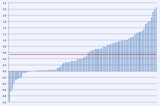 Fastholdelsen af betydelige dele af forskellene i kommunalt niveau for skatteudskrivning har alt i alt ledt til en situation, hvor sammenhængen mellem beskatningsgrundlag og serviceniveau i kommunerne i realiteten er blevet ophævet, som det er påvist i figur 15. I figuren måles ad y-aksen hvor stærk sammenhæng som findes mellem serviceniveau og beskatningsniveau i de enkelte år. Det ses, at der i første halvdel af 1990’erne tydeligt var en positiv sammenhæng, således at serviceniveauet var højere jo højere beskatningsgrundlaget per indbygger var. I de senere år er denne sammenhæng i realiteten blevet visket ud.
