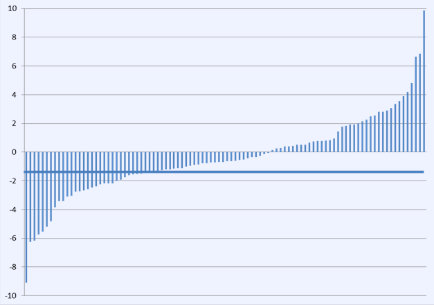 Efter 2010 har kommunerne samlet set fået anerkendt, at aftalerne med staten om kommuneøkonomien er blevet overholdt. Det dækker over, at kommunerne har præsteret ganske forskellig evne budgetdisciplin. Figur 19 tegner et billede af situationen, som den gjorde sig gældende i 2015. Samlet set præsterede kommunerne et underforbrug i forhold til de lagte budgetter, men godt en fjerdedel af kommunerne overskred de udgiftsbudgetter, som de selv havde lagt.