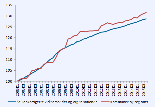 Danmarks Statistik udarbejder en kvartalsvis lønstatistik, hvor det er muligt at sammenholde lønudvikling i kommuner og regioner med udviklingen i private virksomheder og organisationer. Figur 4 viser, at kommunernes og regionernes lønudvikling tog et veritabelt spring op over den private lønudvikling efter 2009. Der er ikke siden foregået nogen genopretning af denne forskydning.