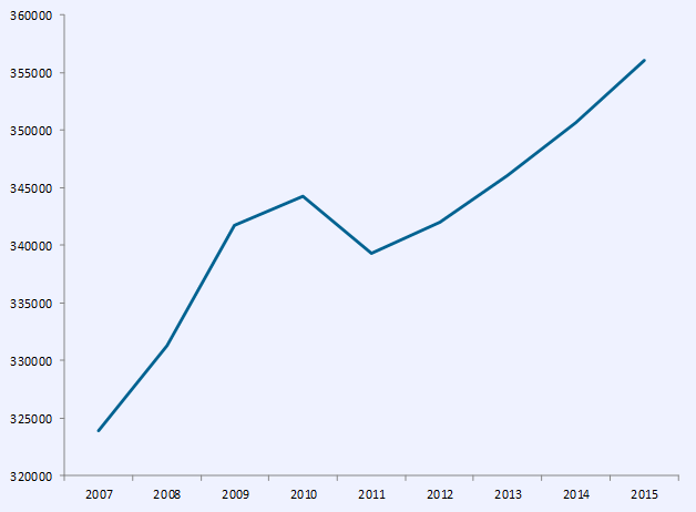Det stort set uændrede reale niveau for bruttodriftsudgifter til serviceydelser og administration siden 2011 er blevet fulgt af en reduktion i antallet af beskæftigede i kommunerne, som ses i figur 3. Reduktionen er dog fladet ud efter 2012.