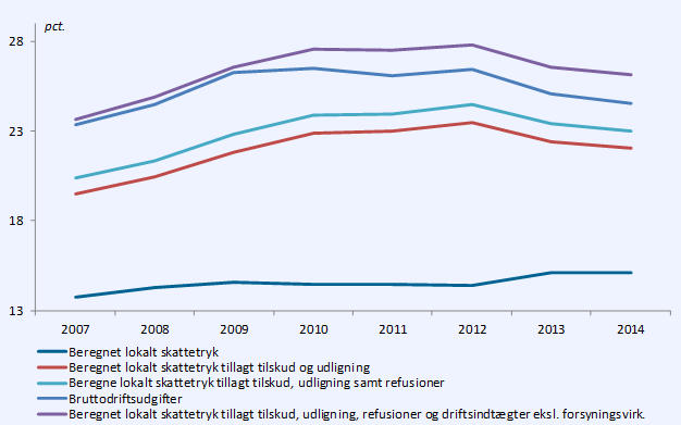De senere års vigende reale kommunale aktivitet er på kommunernes indtægtsside blevet modsvaret af en stigende lokal skattebyrde på den lokale befolkning. Det er illustreret i figur 6. Her er konstrueret et mål for den samlede tyngde af kommunernes skatteopkrævning, idet provenuet fra alle de lokale skattekilder er sat i forhold til massen af bruttoindkomster i kommunen. Det beregnede lokale skattetryk angiver, hvor stort et indhug de lokale skatter gør i de opgjorte bruttoindkomster, forinden de disponible indkomster står tilbage. For så vidt angår den lokale ejendomsbeskatning indgår et indirekte moment i det beregnede lokale skattetryk. Ejere af fast ejendom kan eventuelt opnå en kapitalgevinst i form af prisstigning på grundværdien, men denne kapitalgevinst indgår ikke i opgørelsen af bruttoindkomsten. Stigende grundværdier kan dermed lede til øgning af betalingen af grundskyld til kommunen uden at der registreres en indkomstøgning. Såfremt en sådan effekt gør sig gældende, kan kapitalgevinster gennem øgede grundværdier øge det beregnede lokale skattetryk. Siden 2007 er det således beregnede samlede lokale skattetryk vokset fra 13,5 procent til 15,2 procent. Øgningen i lokalt skattetryk er i hovedsagen foregået ved, at byrden af den lokale indkomstbeskatning i forhold til bruttoindkomsterne imidlertid er blevet tungere, men den kommunale grundskyld har stort set været holdt fast set i forhold til de tjente indkomster.