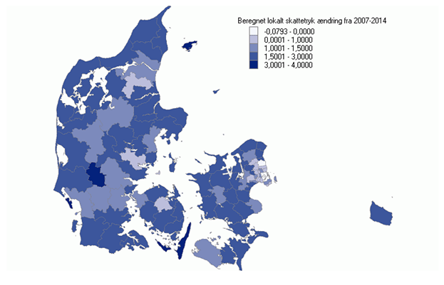 Det er stort set alle 98 kommuner, som hver især har fulgt et udgiftsforløb svarende til et omvendt U, jfr. Birkvad (2010). Der har imidlertid været væsentlig forskel kommunerne imellem hvad angår udviklingen i beskatning. Danmarkskortet i figur 8 viser, hvorledes det beregnede lokale skattetryk har ændret sig siden 2007. Få kommuner har sænket det beregnede lokale skattetryk eller fastholdt det nogenlunde uændret. De fleste kommuner har i varierende omfang øget den lokale skattebyrde.