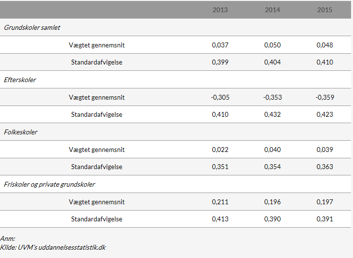 Det socioøkonomiske indeks fra Ministeriet for Børn, Undervisning og Ligestilling beregnes i en samlet beregning for alle grundskoler under ét. Da der er tale om et indeks, skal gennemsnittet for alle grundskolerne i princippet være lig med nul. Nogle skoler løfter eleverne stærkere end gennemsnittet, mens andre skoler løfter eleverne svagere end gennemsnittet. Af beregningsmæssige årsager afviger et vejet gennemsnit dog minimalt fra nul, som det fremgår af tabel 1. De tre grundskoleformer, folkeskoler, frie grundskoler og efterskoler, kan hver især have gennemsnitlige socioøkonomiske indeks, som afviger fra nul. Det er rent faktisk også tilfældet, som det ligeledes er vist i figur 1.