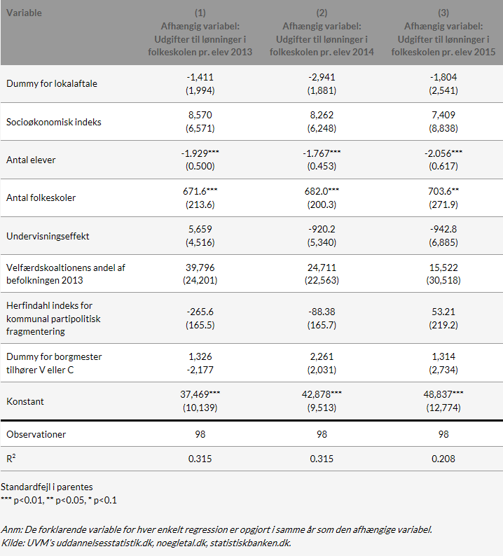 Regressionsanalysen har som resultat, at der på kommuneniveau fremkommer stordriftsfordele, og at disse stordriftsfordele ser ud til at fremstå stærkere i 2015 end i de forudgående år, hvad der kan være et resultat af skolereformen. Endvidere ses kommunernes skolebudgetter pr. elev at være påvirket af lokalsamfundets socioøkonomiske sammensætning, så svagere socioøkonomi er forbundet med højere udgiftsniveau.