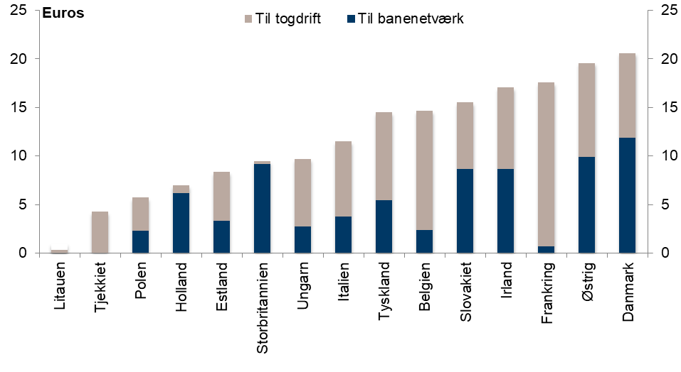 Også i Nederlandene fungerer togdriften uden tilskud, jf. figur 4. Når tilskuddene til bane og tog lægges sammen, lå Danmark i 2012 højst blandt de europæiske lande.