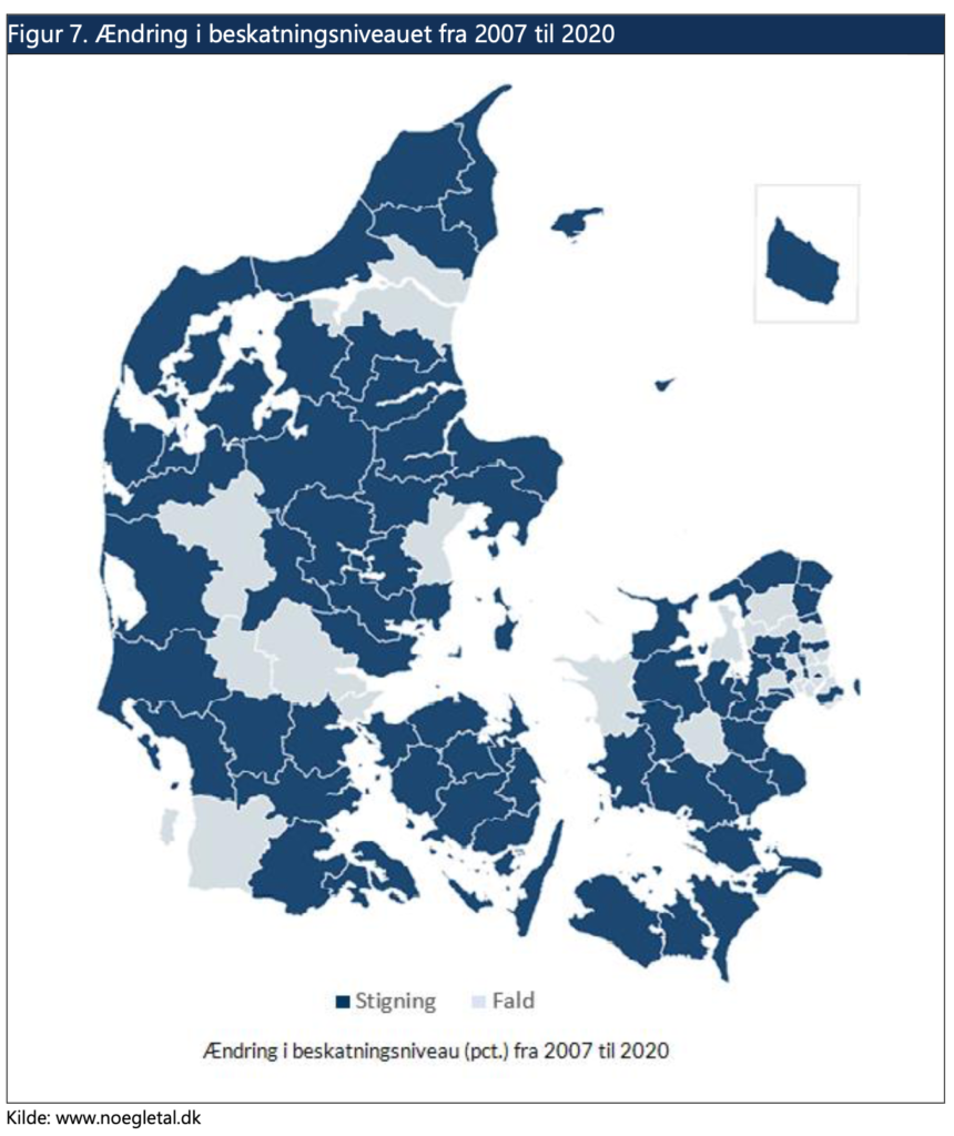 Disse vælgergrupper vil have et øget ønske om stigende offentlige udgifter og skatter. På længere sigt kan de øgede skatter i høj grad hæmme udviklingen i den lokale vækst og beskæftigelse, hvilket kan føre til en afvandring og dermed yderligere reduktion af personer i den erhvervsaktive alder med høj indkomst mod vækstcentrene. Dette understøttes af, at det af figur 7 fremgår, at det hovedsageligt er i områderne med faldende velfærdskoalition, der har været et fald i beskatningsniveauet.