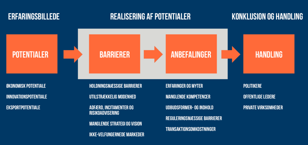 Den nuværende begrænsede konkurrenceudsættelse betyder, at Danmark går glip af en afgørende modning af og innovation på det private marked samt potentielt store eksportmuligheder. Analysen peger desuden på, at udlicitering i dag tilrettelægges på en måde, så potentialet for innovation ikke udnyttes fuldt.