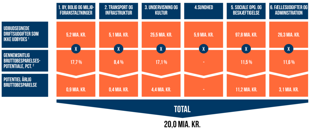 Struensee 6 co.s analyse viser, at der er et potentiale for udlicitering på over 200 milliarder kroner, og at der er et direkte økonomisk besparelsespotentiale på ca. 20 mia. kr. ved øget inddragelse af private leverandører. Det rummer mulighed for, at kommunernes omprioriteringsbidrag øges til 2 pct. om året i en fireårig periode, da inddragelse af private leverandører kan sikre, at effektiviseringen kan foregå, uden at det får betydende konsekvenser for mængden og kvaliteten af de kommunale velfærdsydelser.