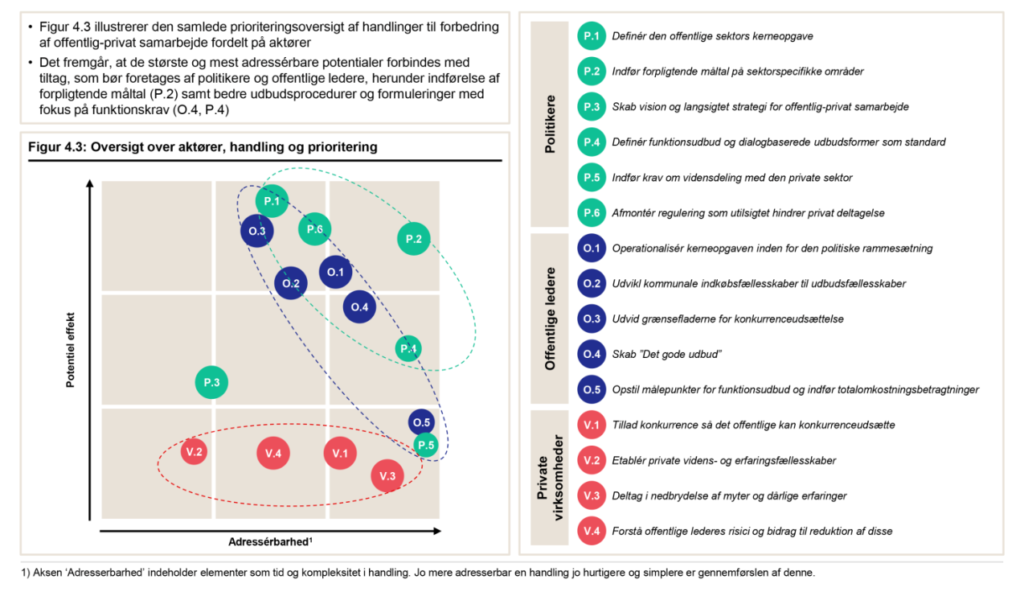 Politikere, offentlige ledere og private virksomheder er de centrale aktører og beslutningstagere i relation til at få fjernet beskrevne barrierer. Struensee & co. har ud fra de gennemførte interview med centrale beslutningstagere peget på de mest effektive konkrete tiltag, som kan afmontere ovennævnte barrierer. Struensee har endvidere analyseret de enkelte tiltags gennemførbarhed og effekt i forhold til at indhøste potentialerne ved inddragelse af private leverandører i produktionen af offentlige serviceydelser.