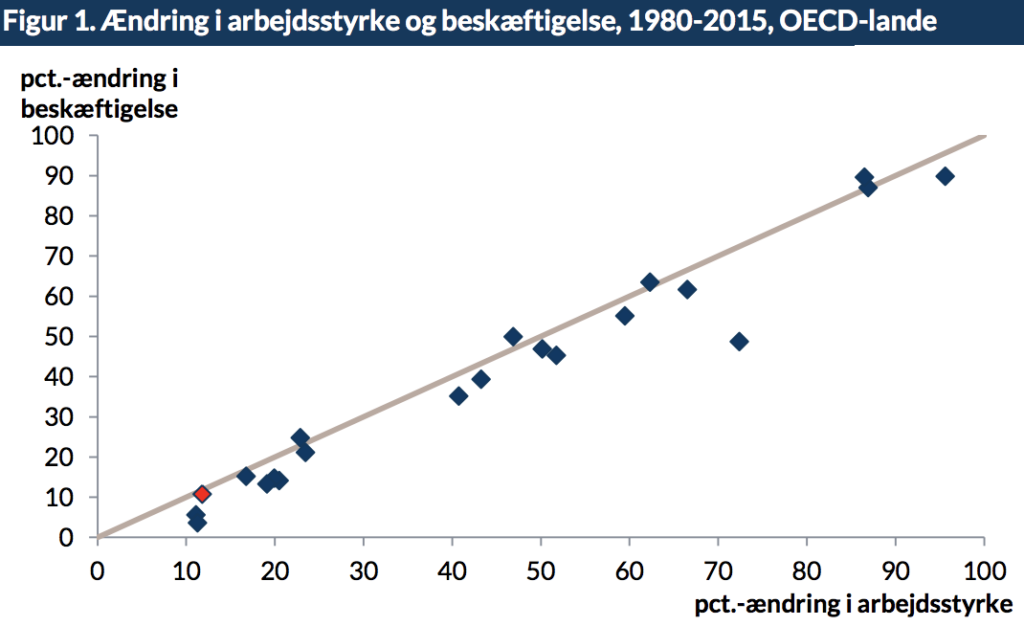 Hvis et større arbejdsudbud ikke resulterede i øget beskæftigelse, ville der ikke være en entydig tendens til, at store lande har større antal beskæftigede end små. Som det fremgår af figur 1, er der imidlertid en klar sammenhæng mellem arbejdsudbud og beskæftigelse, hvis man sammenligner lande.