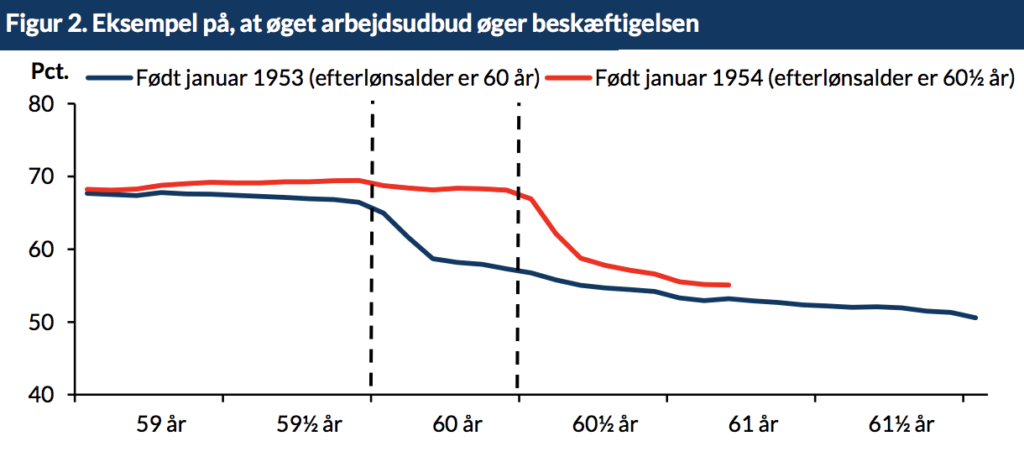 I figur 2 sammenlignes beskæftigelsesfrekvensen for to grupper af individer: En gruppe af individer, som er berettiget til efterløn, når de fylder 60 år, og en anden gruppe af individer, der først er efterlønsberettiget, når de er 60 ½ år gamle. Det ses, at gruppen, der har en efterlønsalder på 60 ½ år, har en markant højere beskæftigelsesfrekvens som 60 årige, end den tilsvarende gruppe, der har en efterlønsalder på 60 år. Dette indikerer kraftigt, at det øgede arbejdsudbud indebærer beskæftigelse.