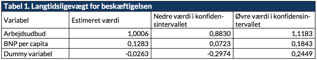 I tabel 1 er angivet de fundne langtidselasticiteter for beskæftigelsen – altså hvordan 1 pct.s stigning i de enkelte variable påvirker beskæftigelsen i procent.