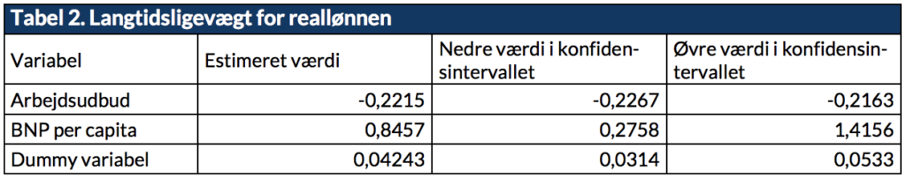 I tabel 2 vises langtidsligevægten for reallønnen.
