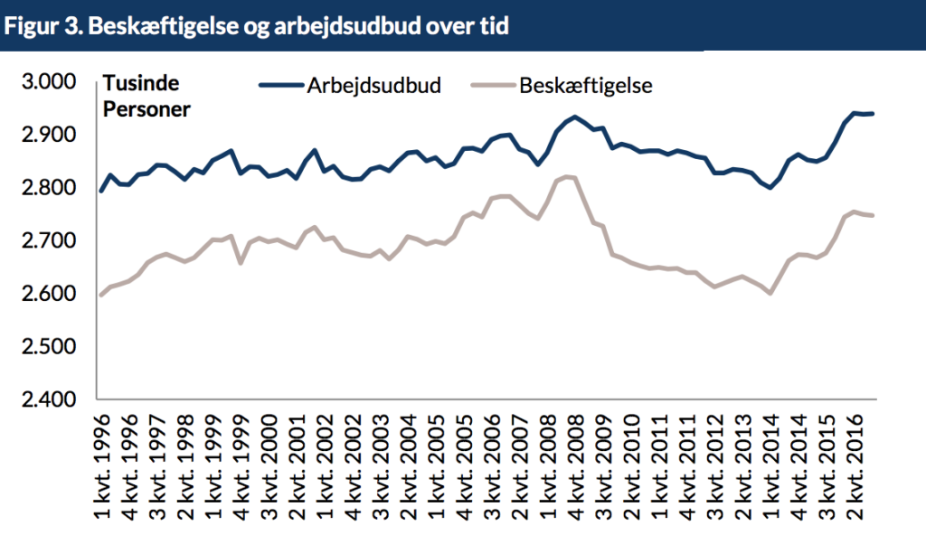 Det ses af figur 3, at arbejdsudbuddet og beskæftigelsen overordnet set følger hinanden tæt gennem de seneste tyve år i den forstand, at afstanden mellem de to grafer ikke øges markant over tid. Undtagelsen er finanskrisen, hvor beskæftigelsen faldt meget mere end arbejdsudbuddet. Det bemærkes, at afstanden mellem arbejdsudbuddet og beskæftigelsen er lig med arbejdsløsheden.